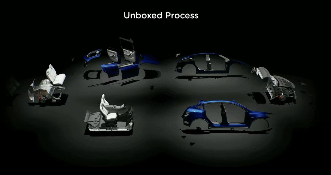 其次是重构全部环节,以车身为核心,其他所有部件分成六个模块,不同模块在独立子线上并行生产(比如四门两盖有自己模块对应的冲压、焊接、涂装、“总装”sub-lines),模块完成预组装后,汇合到车身线一齐“开箱”完成与车身的最终总装,用以减少传统“冲焊涂总”生产模式中的动作重复、降低传统总装线的空间占用以及分流传统总装工序的工作量和零部件库容。